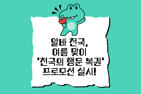 구인구직 아르바이트 전문 포털 알바천국이 무더운 여름을 시원하게 식혀줄 특별한 이벤트, ‘천국의 행운복권’ 프로모션을 시작했습니다. 이번 이벤트는 여름철 알바생들과 사장님들을 위한 실속 있는 선물과 재미를 동시에 제공하는 즉석 당첨 이벤트입니다.